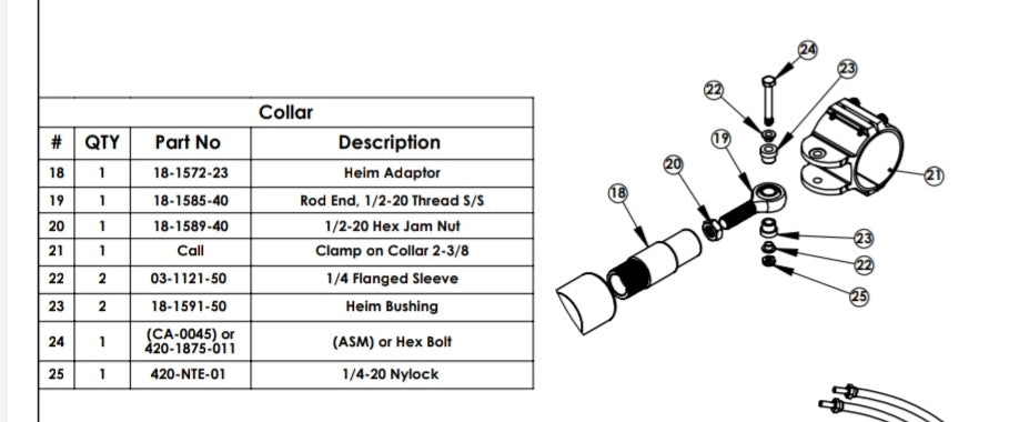 Used to attach layout cylinder to outrigger collar. Includes jam nut 18-1589-40, plastic heim (bushing) spacers 18-1591-50 (x2), and bolt 420-1875-011 with bushings 03-1121-50, 03-1253-50, and nut 420-NTE-01 (CA-0045 assembly).
